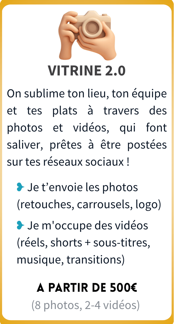 Capturer les instants inoubliables, mettre en avant tes plats signatures et créer une vitrine 2.0 qui attire, inspire et donne envie de réserver.