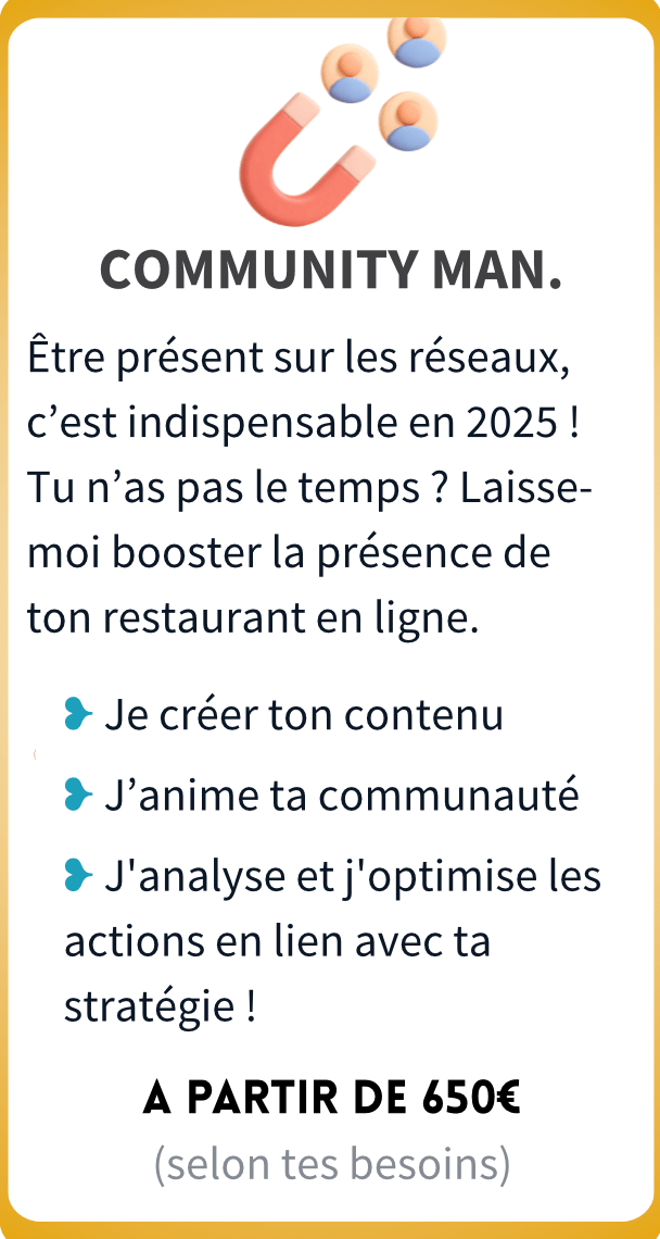 Community Manager - Coach & Formateur, spécialisé dans l'univers de la food, j'accompagne les restaurateurs à se différencier de leurs concurrents sur les réseaux sociaux.